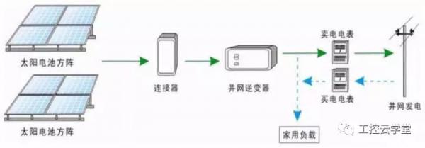 太阳能电池组件→逆变控制器→配电箱及智能电表→公共电网