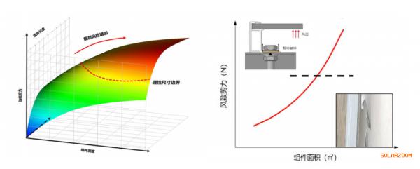 如下左图所示,随着组件长度、宽度的增大,边框的应力持续增加,超大尺寸组件面临极高的应力风险。另一方面,组件尺寸的加大将使其受到的风、雪压增大,边框安装点所受的剪切应力相应提高,边框因风载撕裂的风险显著提高。此外,组件抗动态机械载荷的能力将随着尺寸变大而降低,加上超大尺寸组件所使用的超大玻璃目前尚未量产验证,这方面的风险也将更加不可控。