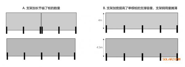 大尺寸组件所带来的BOS成本降低主要来自支架与基础成本的节省,其占比可达80%。而支架与基础成本的节省本质上源于大支架设计带来的节省,包括长支架节省桩基础数量,以及宽支架摊薄支架与基础的单W成本。
