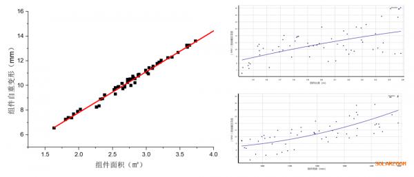 超大尺寸组件除了边框应力的增加,仅自身重量就会导致其变形量显著增加,如下图所示,组件面积3㎡时,自重变形可达11mm;右图进一步可以看出,组件变宽对变形量的影响大于变长。因此在组件的使用及运输、搬运过程中,如此大的变形势必大大增加电池片隐裂的风险,为电站的发电收益带来隐患。
