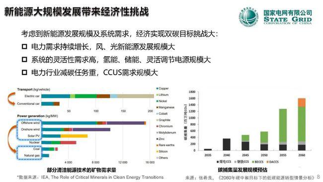 三是关于储能、新能源汽车等新要素。储能在新型电力系统的电力电量平衡中起到重要的灵活调节作用,支撑供需双侧动态匹配,促进新能源有效利用;应该覆盖发输变配用全环节,参与规划、生产、运行、辅助服务等全过程,承担能源枢纽站缓冲节点作用;引导海量电动汽车有序充放电,挖掘可中断、可调节的多源负荷资源,有效增加系统灵活调节能力。
