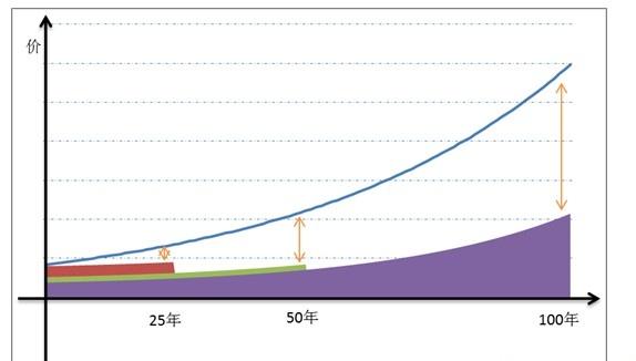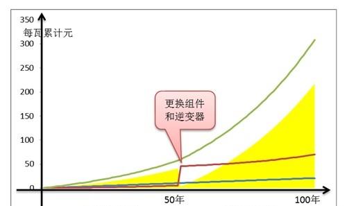 现在我们再通过模型鉴定百年电站的发电成本。和25年电站不同,百年电站并不需要预留现金作债券的赎回,因为50年或100年后的1元,可能比不上今天的1分。因此,将电站的剩余资源(例如玻璃、电缆中的铜等)出售已可获得赎回资金。但百年电站则要考虑期间组件和逆变器的更换。假如技术的进步令逆变器及组件的未来更换价格在今天的折现值(Net Present Value)只有今天价格的50%,寿命50年,我们可以获得下列的图表。