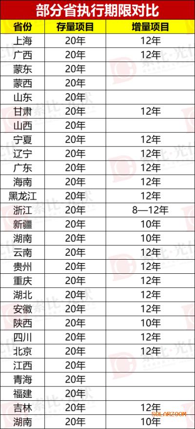 在执行期限上,各省存量项目一般为20年长周期;增量项目则为10年-12年。宁夏、新疆、湖南等省份对增量项目的执行期限通常设定为10年;广东、海南则将增量项目期限延长至12年。