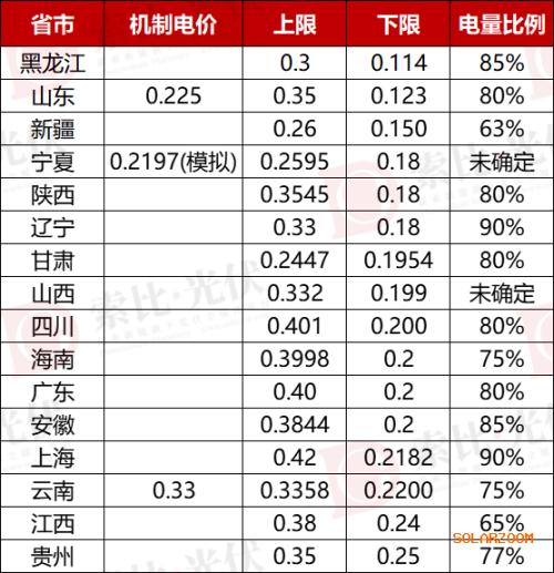从上表来看,大部分省市的增量项目的机制电价竞价下限普遍定在0.2元/度左右,部分省市则上下浮动,最低的为黑龙江的0.114元/度,最高则为贵州的0.25元/度。上限则基本浮动在0.35元/度左右,最低省份为宁夏、甘肃的0.25元/度左右。