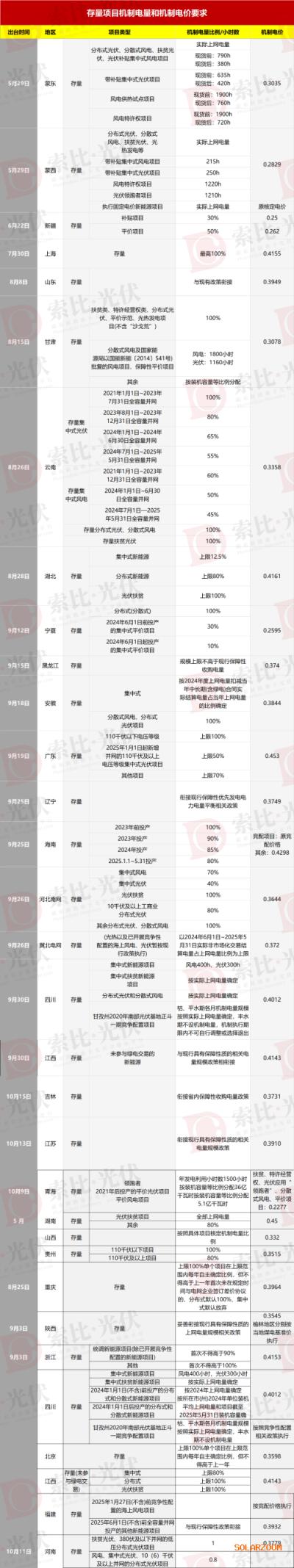 其中,分布式光伏项目,广西、宁夏、云南、蒙西、蒙东、上海、甘肃等省份明确100%电量可纳入机制电量;光伏装机占比较高的湖南比例上限为80%;山东若按2025年政策,新增分布式光伏、分散式风电纳入机制电量的比例分别为85%、70%。