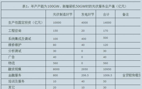 目前,我国光伏产业的产能是30GW,年新增光伏发电装机已经超过了10GW。到2020年,我国的年产量和年新增装机量将分别超过100GW和50GW。这里按照这个规模对于光伏服务业的规模做一个预测,见表1。