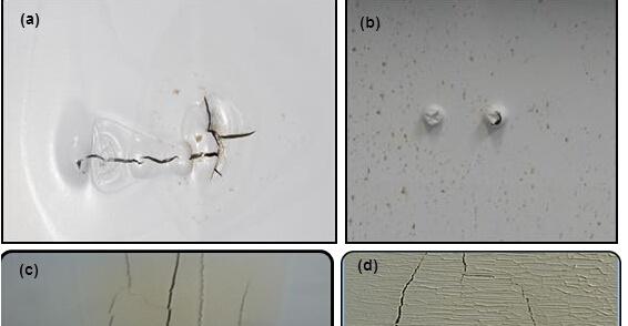 图四. PVDF背板热斑失效。(a)美国亚利桑那安装2年组件背板因热斑熔化和开裂;(b)以色列电站组件背板热斑熔化起泡;(c)西班牙屋顶组件安装2年内背板热斑老化开裂;(d)为(c)的局部放大图