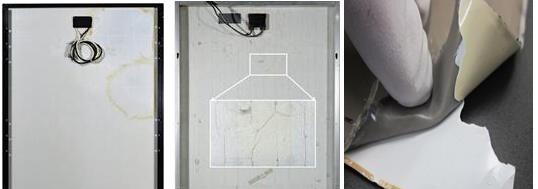 图一. (a)12年日本安装组件PET背板开裂;(b)4年西班牙安装组件PET背板开裂;(c)14年日本屋顶安装组件PET背板发黄脆化
