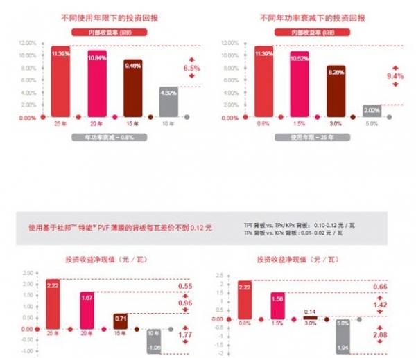 价格方面,基于杜邦™特能®(Tedlar®)PVF薄膜的TPT背板与单面氟膜背板(如单面PVDF背板)价格仅差0.10-0.12元/瓦,只需多发25-29天电就可收回成本差异。而基于杜邦™特能®(Tedlar®)PVF薄膜的TPx背板(如TPE背板)与单面PVDF背板仅差0.01-0.02元/瓦,只需多发1-4天可收回成本差异。优质背板材料带来的投资回报与隐含风险存在质量问题的廉价背板,孰轻孰重,相信充满智慧的投资商算得清。