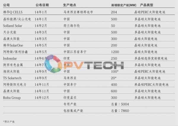 2014年内出现的另一个复兴则是晶硅太阳能电池专门产能扩张,这一趋势值得注意的原因,是因为随着具有更高效率的电池成为产品差异化的关键,并为降低每瓦成本提供了潜在的可能性,因此大多数的产能扩张与PERC电池技术相关。2014年所宣布的晶硅太阳能电池专门产能扩张量达到了5GW,如果算上集成电池/组件的扩产,这一数字则达到了7.6GW (详见表二)。