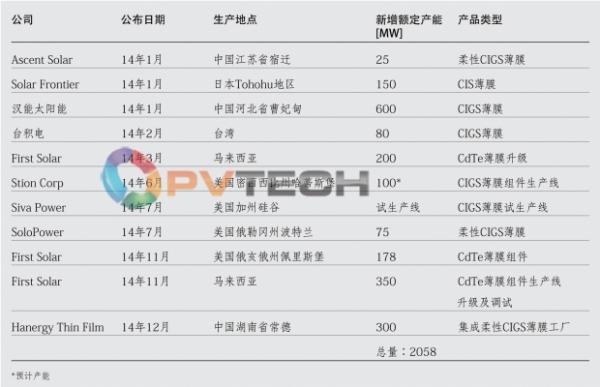 汉能在十二月的300MW产能公告宣告了薄膜技术复苏的一年。在2014年,共有2GW新增产能公告,其中汉能针对旗下所收购的三个公司的两个单独CIGS薄膜工厂占到了主导地位,总量达900MW(详见表一)。