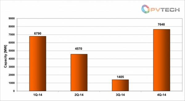 从季度量上来看,很明显,2014年第一季度(6.79GW)和2014年第四季度(7.64GW)的产能扩张公告活动最为活跃,相较于年中其他季度,数字间有着显著差距(详见图三)。