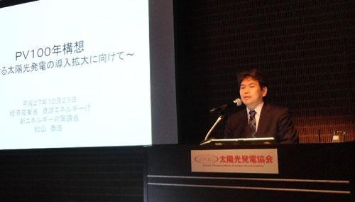 日本光伏发电协会(JPEA)10月23日在东京都举行了“光伏发电研讨会”。经济产业省新能源对策课课长松山泰浩登台,以“PV100年构想~进一步实现光伏发电的导入扩大~”为题发表了演讲。
