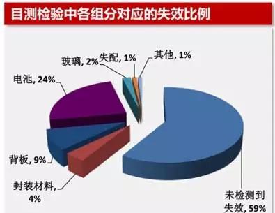 从检测结果来看,未检测到外观失效的组件比例占到了59%,也就意味着还有41%的组件是存在一定外观失效问题的。这其中电池所占的比率是24%,其次是背板,占到了9%。光伏组件中,电池和背板是最重要的两个影响因素。