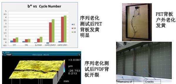 由上图可知,按照方案1进行序列老化测试之后,PET背板组件明显发黄、老化,同期进行测试的PVDF背板也出现了开裂的情况。这与之前发现的户外实际结果是相吻合的,可见序列老化测试能够准确的模拟户外环境,有效评价背板材料的长期可靠性和耐久性。