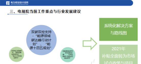所有任务的最顶端,就是“双碳”、“双控”。在这一领域,规划总院一方面是开展能源领域的碳达峰计划,因为80%左右的碳排放是能源。而能源领域又不仅仅是电力,是煤、电、油、气、新能源所有领域的耦合,是一个系统化的解决方案;另一方面是做好能源“十四五”规划的双轨对接工作。第一项主要工作是研究如何在没有补贴,又要逐渐增加系统成本的情况下进行有效考核;第二项主要工作是围绕新能源电力系统,制定系统化解决方案与路线图,增加消纳空间;第三件主要工作是研究多元消纳机制。