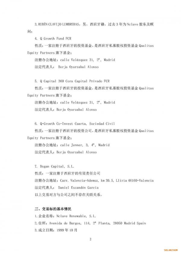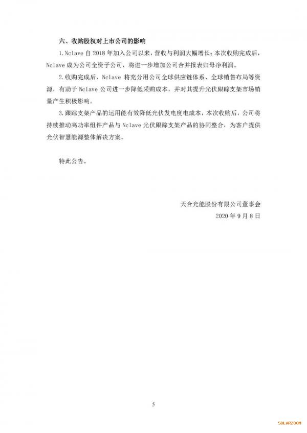 2020年9月8日,天合光能股份发布公告,宣布继续收购Nclave公司(Nclave Renewable,S.L.)剩余49%股,本次交易总对价为4272.78万欧元,收购完成后,Nclave公司将成为天合光能全资子公司。