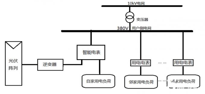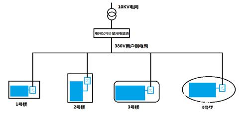 为了便于计量和管理,光伏发电的接入点通常都要接入到电网公司计量电表的前端或附近(图5)。这就给单位规模较大,楼宇较多的单位实施光伏发电建设带来了比较大的难题,要求在单位内部建设发电专线电网,无形中就增加了投资和工作量。