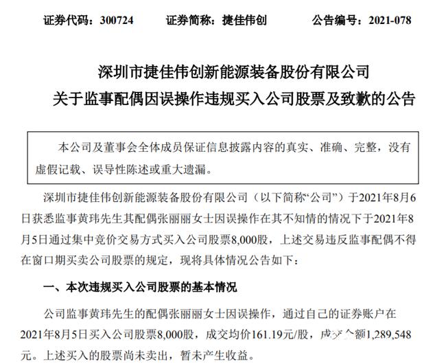 8月8日,深圳市捷佳伟创新能源装备股份有限公司紧急发布了《关于监事配偶因误操作违规买入公司股票及致歉的公告》。公司于2021年8月6日获悉监事黄玮其配偶张丽丽因误操作在其不知情的情况下于2021年8月5日通过集中竞价交易方式买入公司股票8000股。