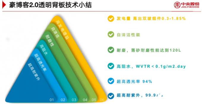 透明背板组件面世以来,经过多方,多地区,不同气候区对比,采用透明背板双面组件较双玻双面组件发电量高0.3-1.85%不等,透明背板的优势进一步凸显。中来以创新技术推动大尺寸背板组件降本提质,践行公司“少消耗,多发电”理念,豪博客2.0透明背板具备自清洁能力和高透光率,减少电站维护成本,增加光伏发电量。