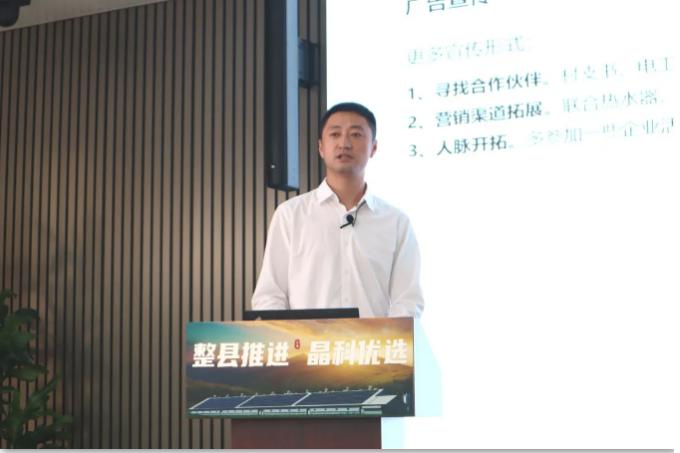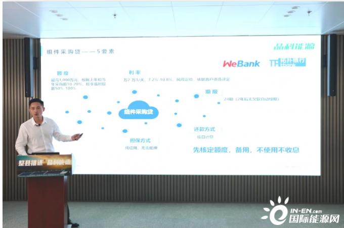 “在整县推进之下,企业如何从组件采购贷、工商业融资租赁、户用光伏带三方面助力项目落地。目前晶科与微众银行、拓扑银行建立合作,在额度、利率、期限、担保、还款五个步骤为代理商争取最大权益,简化认证与放款流程,提升整体效率。随着业务范围持续扩大,未来晶科将会推出更多金融模式,包括但不限于:敞口授信、汇票贴息、流动贷款、供应链融资。”