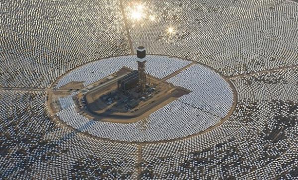 这座太阳能牧场座落在南加州Mojave沙漠中,占地5.5平方英哩、称为中央集光塔的中央高塔高度为459英呎;透过30万片定日镜(heliostat)玻璃随着太阳移动跟着变换角度,将光线(能量)集中到中央集光塔的顶端,塔顶的热吸收器被加热到极高温,便会启动热交换机和锅炉产生蒸气来驱动发电机。这座目前世界上最大的太阳能电厂,发电量可应付14万个家庭使用,相当于美国30%总太阳能发电量。
