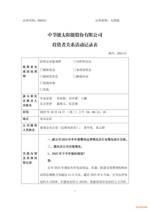 10月15日,中节能太阳能投资者关系活动记录表公布,针对2025年下半年装机规划情况,太阳能表示,公司2025年规划光伏电站投运、在建、拟建及签署预收购协议的总规模力争超过13.6吉瓦。