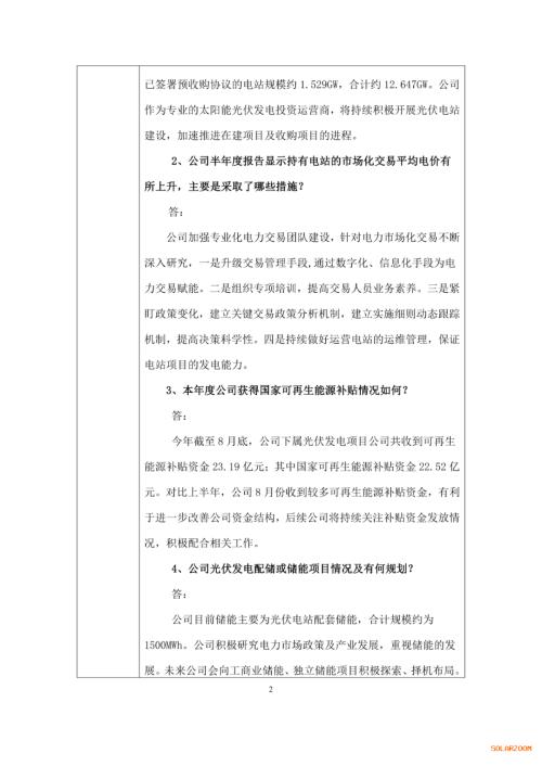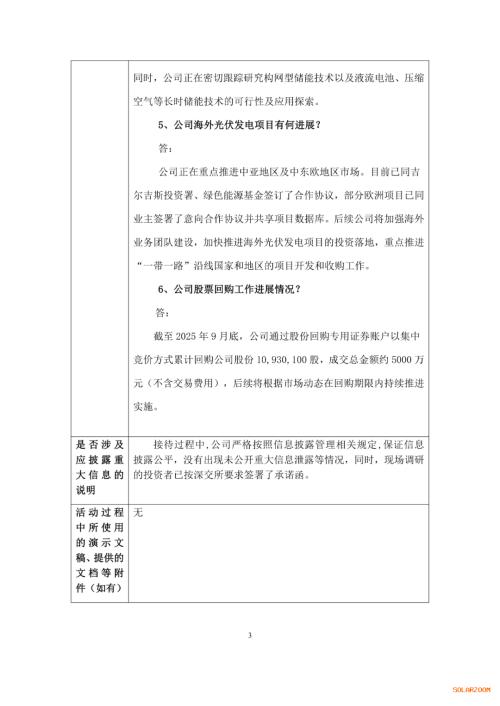截至2025年6月底,公司运营电站约6.535GW、在建电站约2.365GW、拟建设项目电站约2.217GW、已签署预收购协议的电站规模约1.529GW,合计约12.647GW。公司作为专业的太阳能光伏发电投资运营商,将持续积极开展光伏电站建设,加速推进在建项目及收购项目的进程。