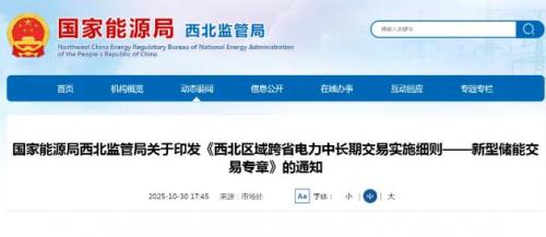 10月30日,国家能源局西北监管局印发《西北区域跨省电力中长期交易实施细则——新型储能交易专章》,文件指出,新型储能交易是以新型储能电站充电电量和放电电量为标的物的电力中长期交易品种。