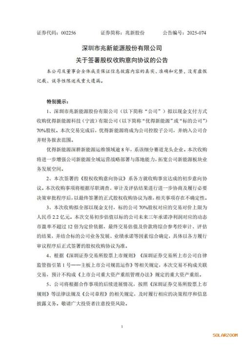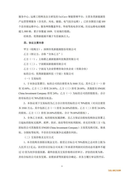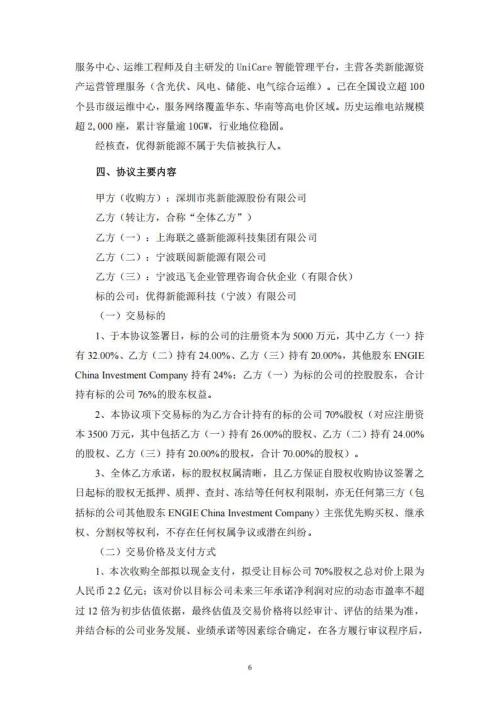 根据公告,兆新股份拟以现金支付方式收购优得新能源科技(宁波)有限公司(以下简称“优得新能源”或“标的公司”)70%股权。本次交易完成后,优得新能源将成为公司控股子公司,并纳入公司合并财务报表范围。本次收购拟全部以现金支付,标的公司70%股权对应的交易对价上限为人民币2.2亿元。