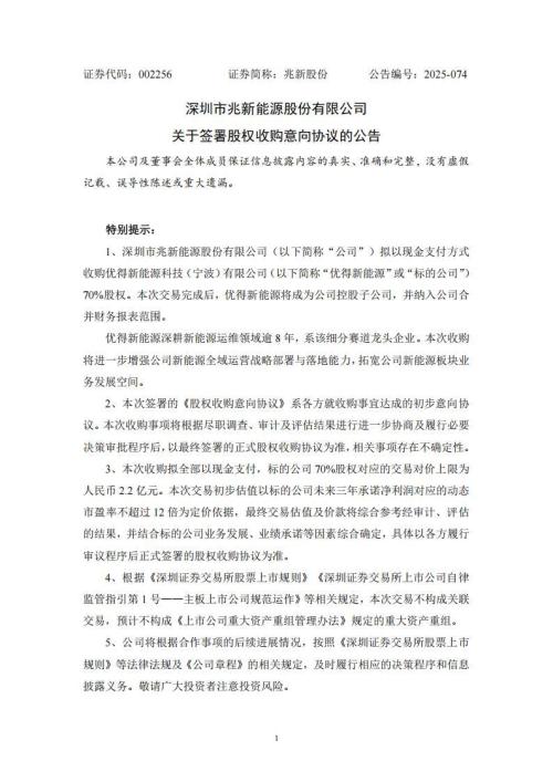 12月12日,兆新股份发布关于签署股权收购意向协议的公告。