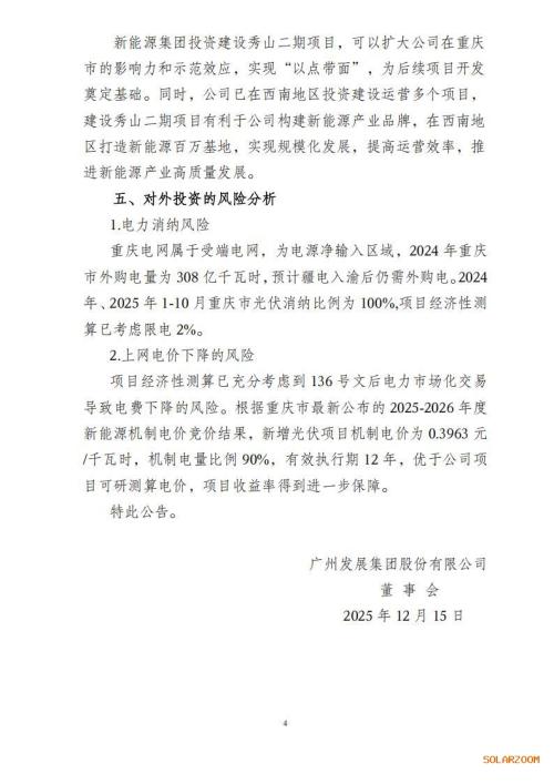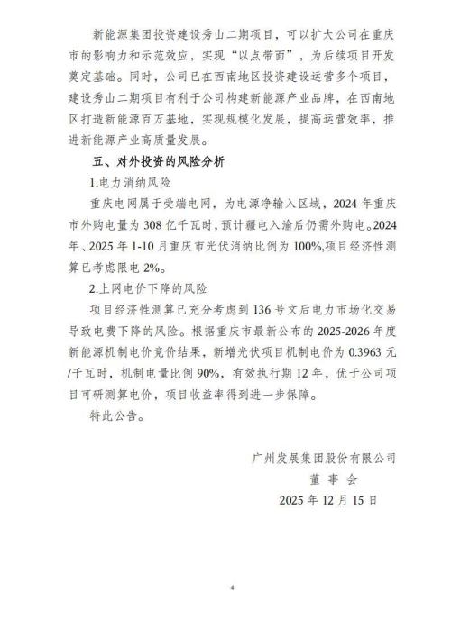 12月16日,广州发展发布关于投资建设秀山龙凤坝光伏发电(二期)项目的公告。