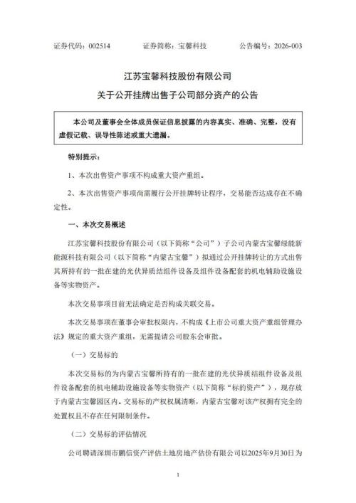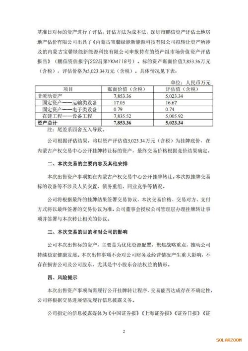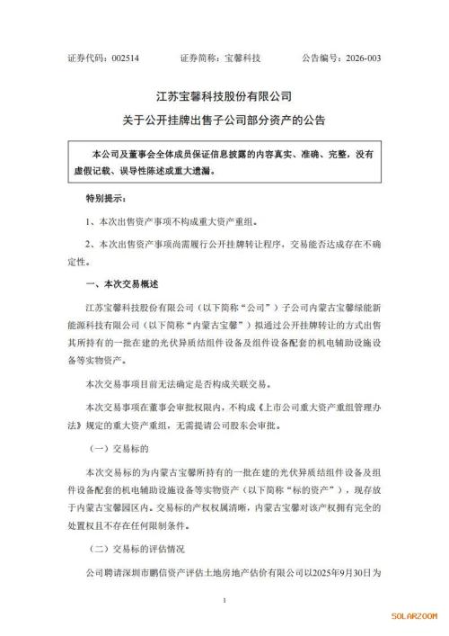 公告显示,宝馨科技子公司内蒙古宝馨绿能新能源科技有限公司(以下简称“内蒙古宝馨”)拟通过公开挂牌转让的方式出售其所持有的一批在建的光伏异质结组件设备及组件设备配套的机电辅助设施设备等实物资产。