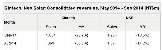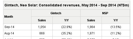 台湾最大的商业太阳能电池生产商新日光能源科技近日公布称,2014年9月,公司合并营收额19.64亿新台币(6500万美元),环比增长4.96%,但环比下滑13.51%。