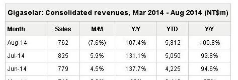 台湾太阳能电池导电浆料开发专家硕禾电子材料(Giga Solar Materials Corp)近日公布称,2014年9月,公司合并营收8.62亿新台币(2850万美元),环比与同比分别增长13.14%与111.37%,且创下月度历史新高。