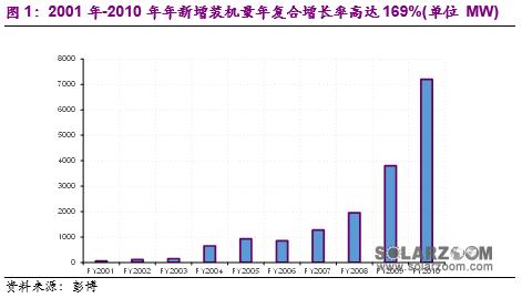 德国政府是光伏行业的先驱,从1990年开始就投入大量的人力物力推动其发展,德国是第一个推出类似于我国标杆电价的国家,而且补贴额度极高,这样促使德国在2001年-2010年年复合增长率高达169%。
