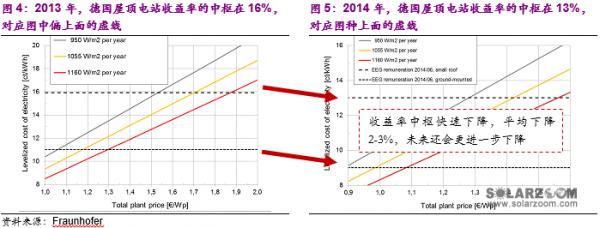 正式由于补贴下降的原因,导致总体收益率明显下降。2013年对于屋顶电站的收益率中枢还在16%左右,但到了2014年其收益率中枢仅为13%。地面电站从11%的收益率下跌至9.5%左右的收益率。