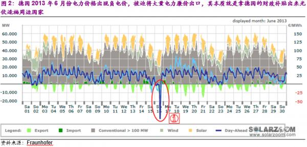 德国光伏出力最大的时段是中午,由于光伏在电力市场上边际成本最低,并且具有优先调度权,当中午大量光伏上网之后,如果预测不准,德国电力市场就会供过于求,在某些时段可能出现“负电价”。出现负电价,意味着如果发电商想要继续发电,就要反向给用户付费。在供过于求的情况下,德国电力以非常低的价格甚至负电价向周边国家输送,这就相当于德国对光伏的补贴随着外送电量流向邻国。