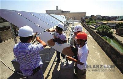工作人员在安装温州市首套家庭薄膜光伏发电系统。