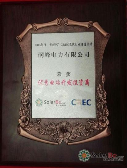 11月5日,由国内知名光伏媒体“索比太阳能光伏网”和《光能》杂志共同主办的2015“光能杯“光伏行业评选结果已揭晓。润峰电力凭借在光伏电站开发建设领域取得的成就,荣获2015年度“光能杯”优秀电站开发投资商殊荣。