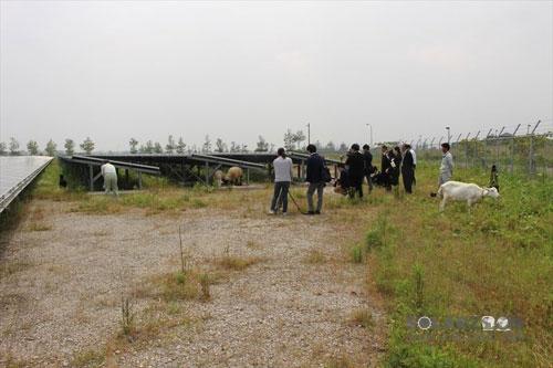 此次的两头山羊在光伏电站的围栏外、四头绵羊在电站内啃食杂草。设想主要用来除掉杂草中的藤蔓植物青藤。围栏外侧由山羊、内侧由绵羊来除掉藤蔓植物的方式比较理想。