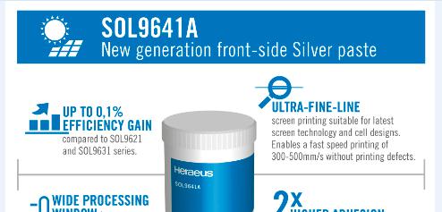SOL9641A的成功推出,标志着贺利氏在帮助太阳能公司降本增效方面的又一个里程碑。公司高层在今年初举办的最新一届国际太阳能光伏展上(SNEC)上,表示相信可再生能源生产成本有可能每五年降低多达50%,这将有助于加快太阳能和其它环保能源的广泛应用。