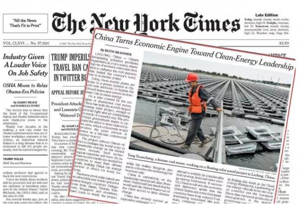 当地时间6月6日,《纽约时报》美国版头版发表文章:弯道超车,中国志在主导未来清洁能源产业。该报对阳光电源在淮南投资建设的全球单体最大漂浮式太阳能项目进行了关注报道,指出该项目反映了中国正在努力重塑可再生能源领域的世界秩序。