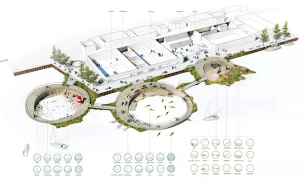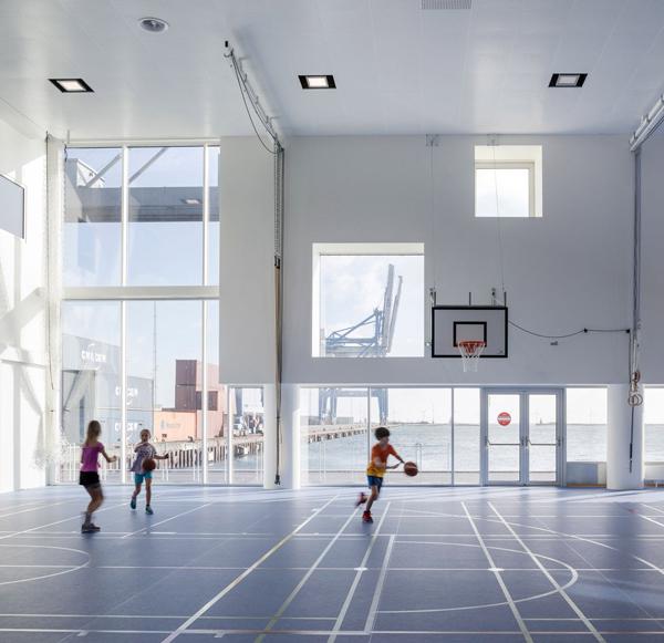 国际学校的顶层设计成了操场,学生在上面自由活动的时候还可以俯瞰海港的美景;建筑的最底层是公共活动空间,包括图书馆、餐厅、文化活动中心、体育场等,通过落地窗,也可以观赏到临水的景致。在这里上学的学生可真是太幸福了。