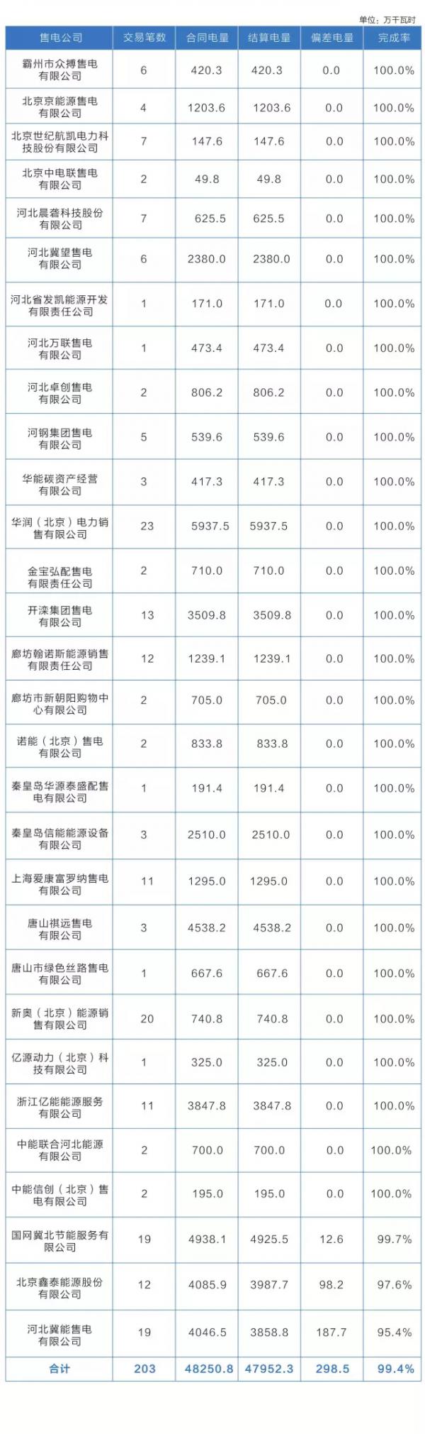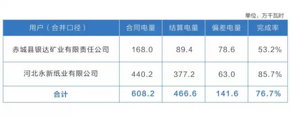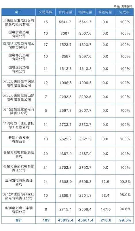 15家冀北统调电厂参与直接交易,合同电量4.58亿千瓦时,实际结算电量4.56亿千瓦时,完成率约99.5%。