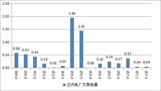 冀北统调15家发电企业参与交易,成交均价为355.53元/千千瓦时,成交价最高为357.50元/千千瓦时,成交价最低为349.00元/千千瓦时。区内电厂(含张家口电厂、王滩电厂)成交电量电价区间如下: