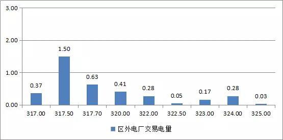 区外11家发电企业参与交易,成交均价为318.98元/千千瓦时,成交价最高为325.00元/千千瓦时,成交价最低为317.00元/千千瓦时。区外电厂成交电量电价区间如下: