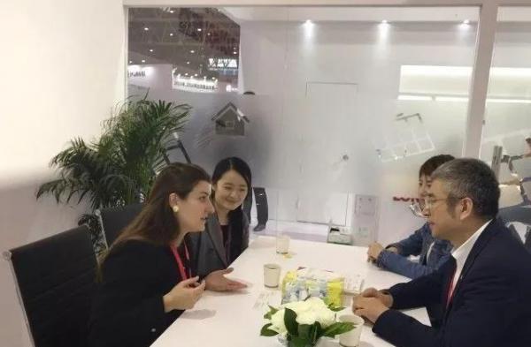 全球太阳能理事会CEO Jodie Roussell女士在光伏行业协会李梦媛博士陪同下参观了隆基展位,与隆基乐叶总裁李文学进行行业交流。