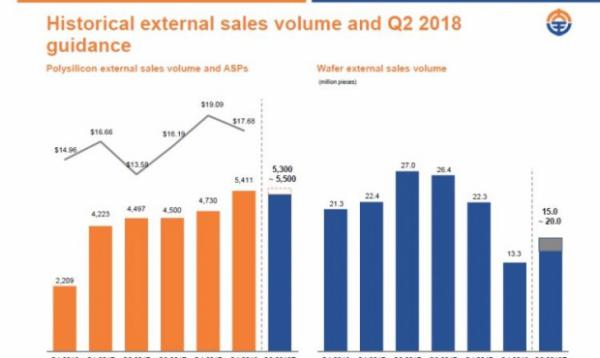 2018年二季度,公司多晶硅产量指导值为5600-5800MT,销量约为5300-5500MT。