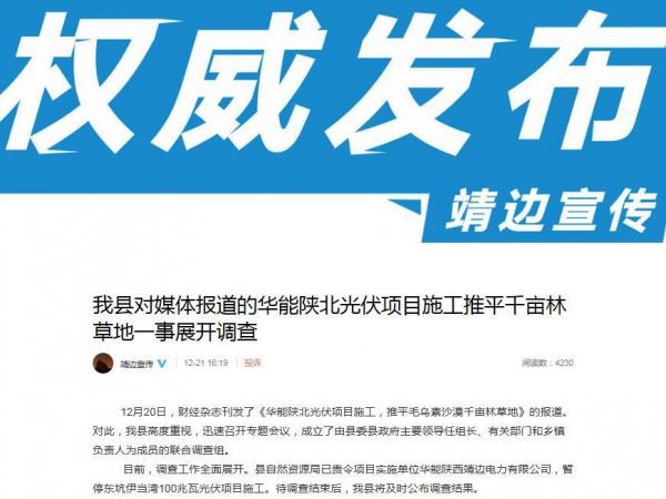12月21日,中共靖边县委宣传部官方微博“靖边宣传”也发文回应称,针对媒体《华能陕北光伏项目施工,推平毛乌素沙漠千亩林草地》的报道,该县高度重视,迅速召开专题会议,成立了由县委县政府主要领导任组长、有关部门和乡镇负责人为成员的联合调查组。